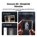 Grâce à son double système de caméras 48 MP avec autofocus, le positionnement est très précis (précision de 0,2 mm), ce qui simplifie l’alignement même pour la gravure interne sur des matériaux complexes comme le verre. Vous disposez aussi d’un agent IA intégré : en un clic, vous pouvez transformer une image ou un texte en gravure 3D interne, sans passer par des réglages manuels compliqués. Enfin, le laser UV gère une multitude de matériaux (verre, plastique, textile, acrylique…) avec des finitions très propres et hautement détaillées.
